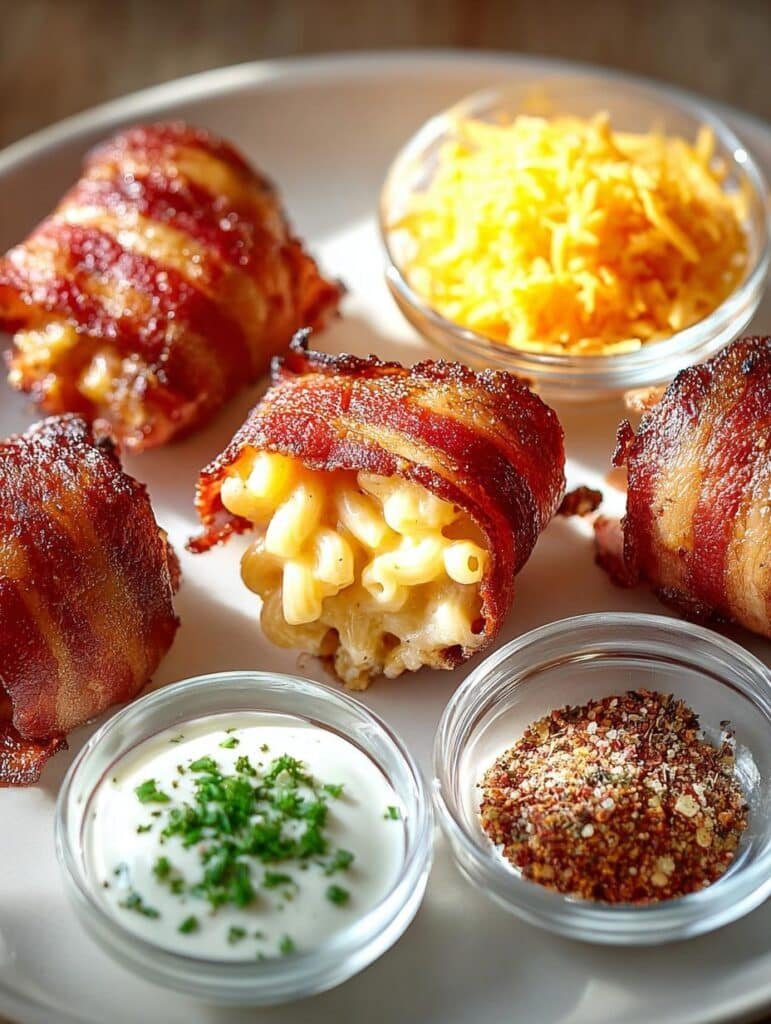 Cheesy macaroni and cheese bites wrapped in bacon, baked to crispy perfection, making a delicious appetizer or fun family dinner.