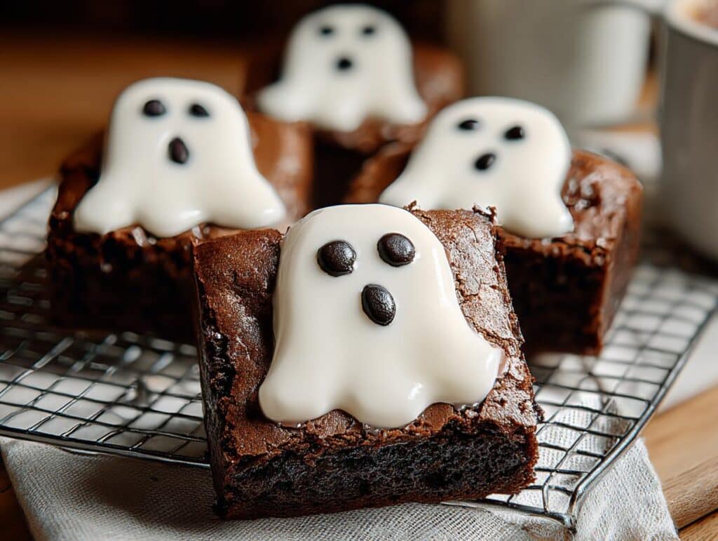 Create spooky, fudgy, and fun Ghost Brownies for Halloween. These easy treats feature chocolate brownie bases topped with adorable marshmallow ghosts and candy eyes, perfect for parties and kids.