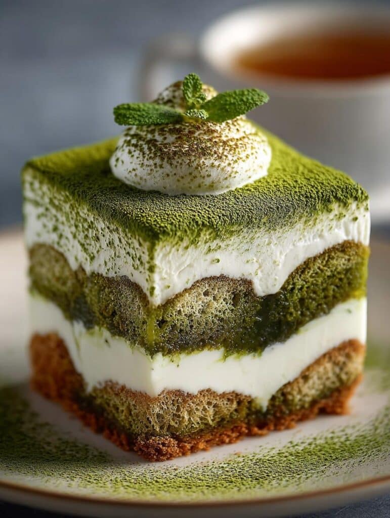 A light yet indulgent fusion dessert combining Italian Matcha Tiramisu structure with Japanese matcha flavor. Layers of matcha-soaked ladyfingers and creamy matcha mascarpone create a vibrant, earthy-sweet treat inspired by a Japanese café experience.