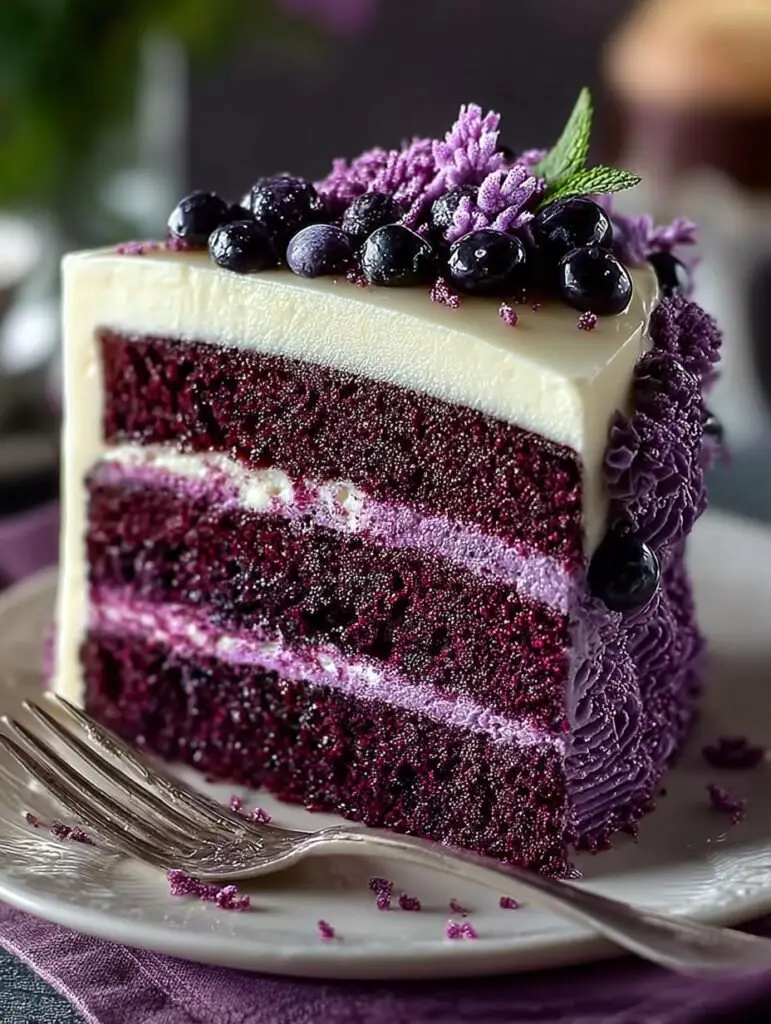 A vibrant culinary masterpiece featuring stunning purple cake layers with a tender, moist crumb, generously coated in a luscious, creamy white chocolate frosting.