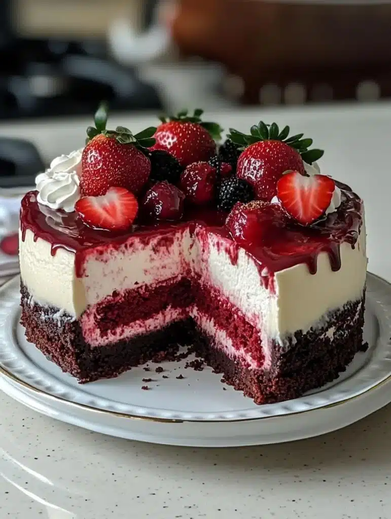 A show-stopping dessert featuring layers of red velvet cake, creamy cheesecake, and fresh strawberries, perfect for any occasion.