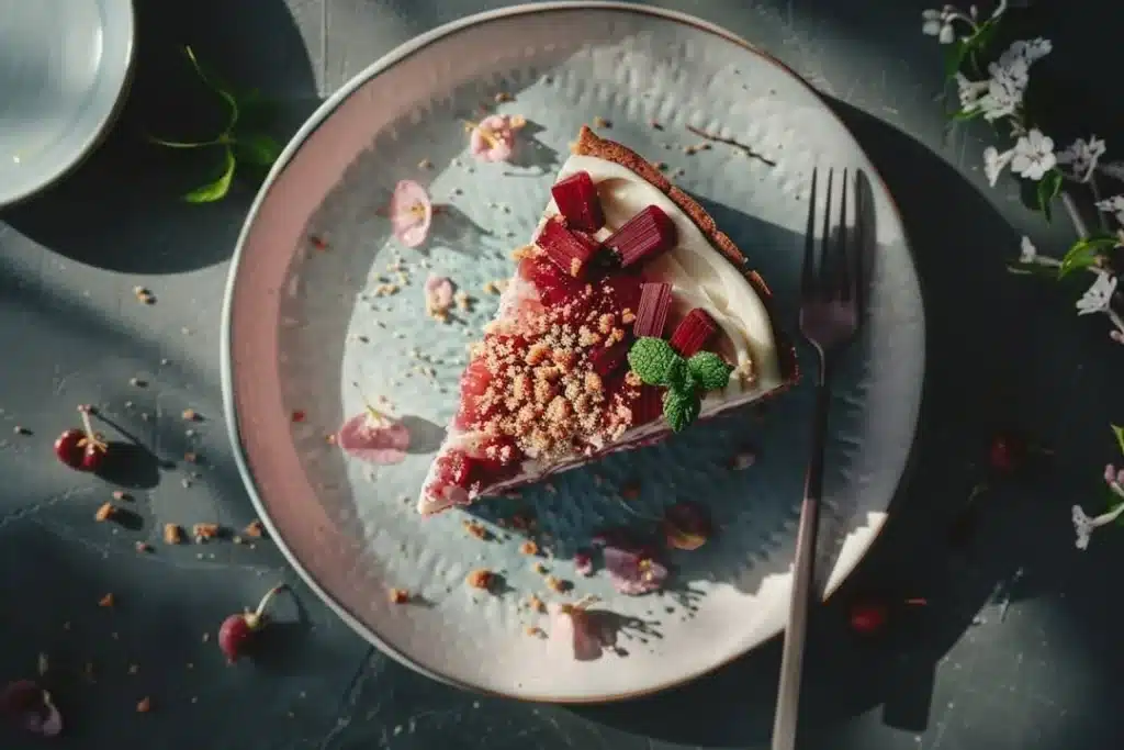 A deliciously sweet and tangy rhubarb dessert topped with a crispy graham cracker crust, perfect for any gathering.