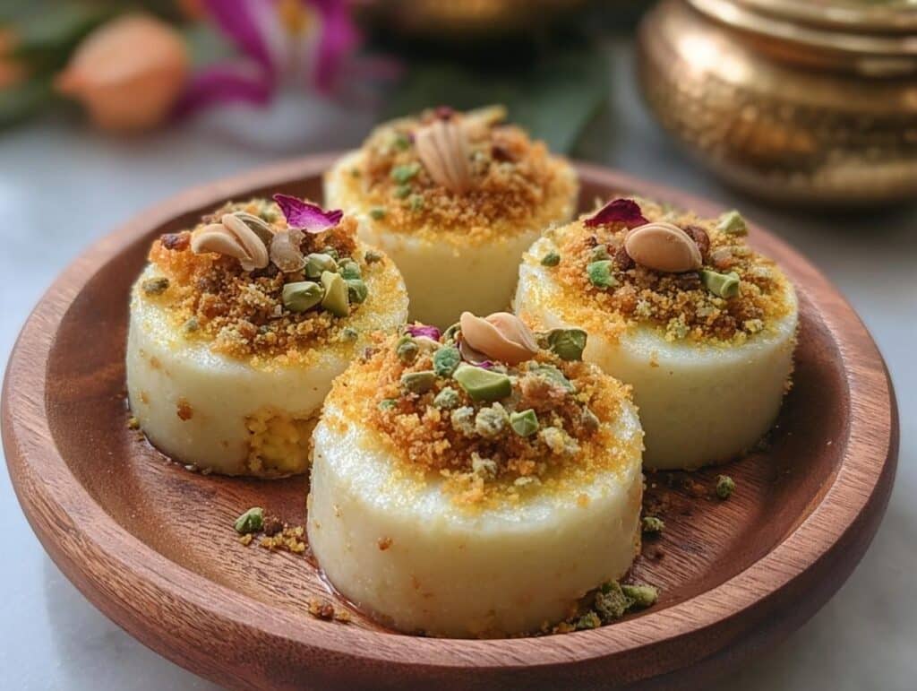 Sitaphal Phirni Motichoor Cups are a delightful fusion dessert where creamy custard apple flavored phirni (a traditional Indian rice pudding) is served inside edible cups made from sweet motichoor ladoos. It’s a festive and elegant treat that combines the smooth texture of phirni with the slightly crumbly, sweet nature of the ladoo cup.