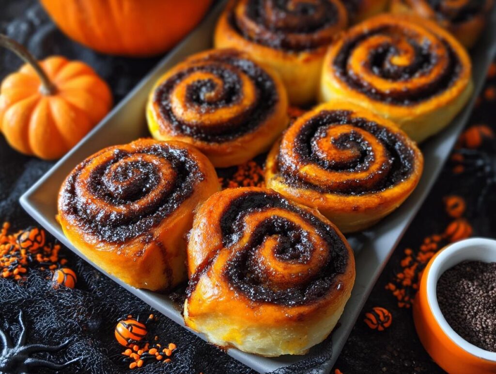 Create festive and delicious Spooky Cinnamon Rolls for Halloween with this easy-to-follow recipe. These visually dramatic treats feature contrasting dark and orange swirls, a rich cinnamon-sugar filling, and a sweet glaze, making them a perfect addition to your Halloween celebrations.