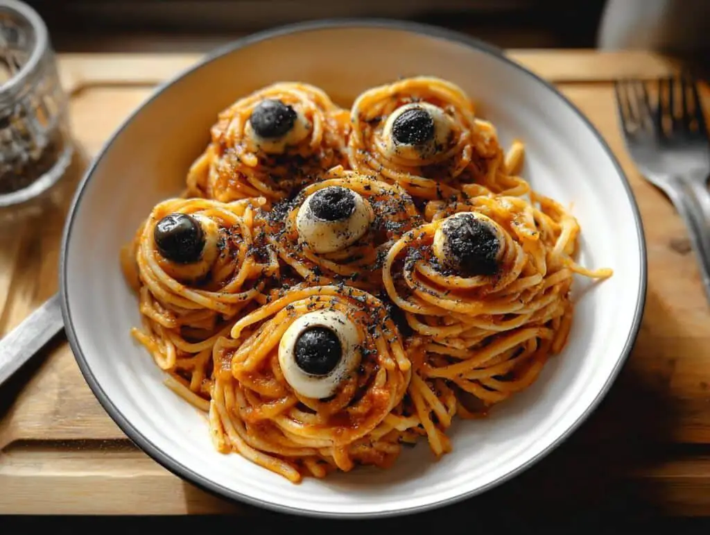 Once your creepy creations are ready, it’s time to serve them up and watch the delight (and maybe a little bit of disgust!) on your guests’ faces. For a truly festive Halloween dinner, I love serving this spooky spaghetti eyeballs dish in individual black or orange bowls. You could also present it family-style in a large, dark cauldron-like pot for an extra dramatic effect. Complementary sides that won’t distract from the main event include a simple green salad with a vinaigrette or some garlic breadsticks. If you’re looking for more pairing ideas that fit our spaghetti eyeball recipe Halloween theme, consider serving some “blood” punch (cranberry or cherry juice) and “monster” Brussels sprouts on the side!
