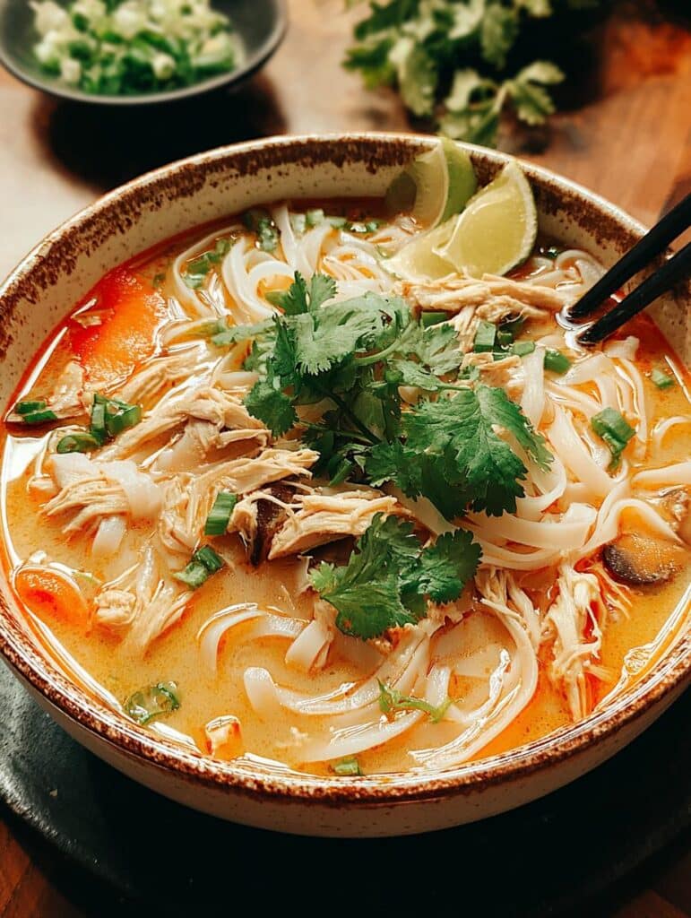 This Thai Chicken Soup with Noodles and Vegetables is a nourishing, aromatic, and creamy bowl of comfort. Infused with curry paste, coconut milk, ginger, and lime, it’s packed with shredded chicken, noodles, and colorful vegetables. Ideal for chilly nights or when you need a healing meal that’s easy, filling, and full of flavor.