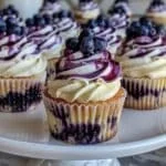 Delicious cupcakes featuring a buttery graham cracker crust and creamy cheesecake filling loaded with fresh blueberries and white chocolate.